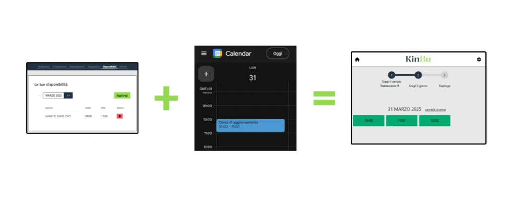 - Aggiornamento degli slot prenotabili: Infine, KinBu mostra ai tuoi clienti solo gli slot realmente disponibili, sottraendo le prenotazioni già effettuate e gli impegni presi.